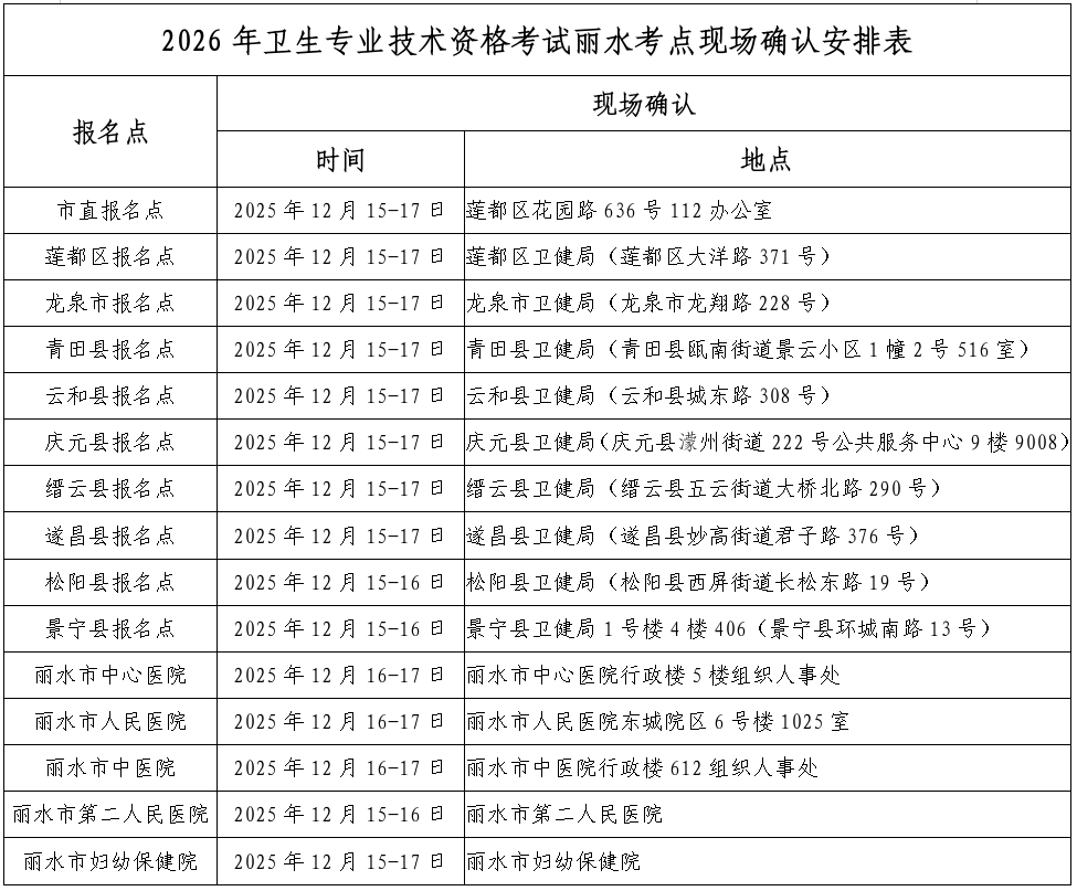 2.现场确认。在2025年12月15日-12月17日期间,考生须持《2026年度卫生专业技术资格考试报名申请表》及相关的证件、材料原件及复印件,到相应报名点进行现场确认(具体确认时间及各报名点地址见下表)。