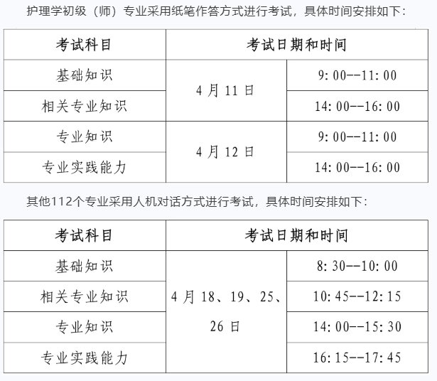 (二)国家统一组织的考试专业共设置“基础知识”、“相关专业知识”、“专业知识”和“专业实践能力”4个科目。其中护理学初级(师)专业采用纸笔作答方式进行考试,其他112个专业采用人机对话的方式进行考试。